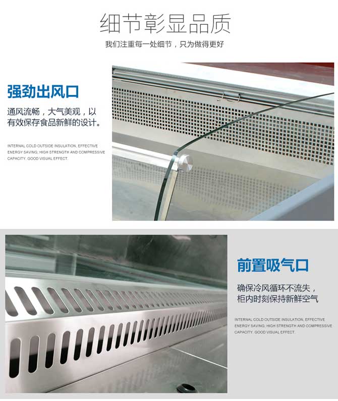 6:風冷型鮮肉柜:完全開放的展示保鮮空間,容量更大,存取更方便;豪華鮮肉柜底板等采用不銹鋼材料,耐腐蝕,易清潔。